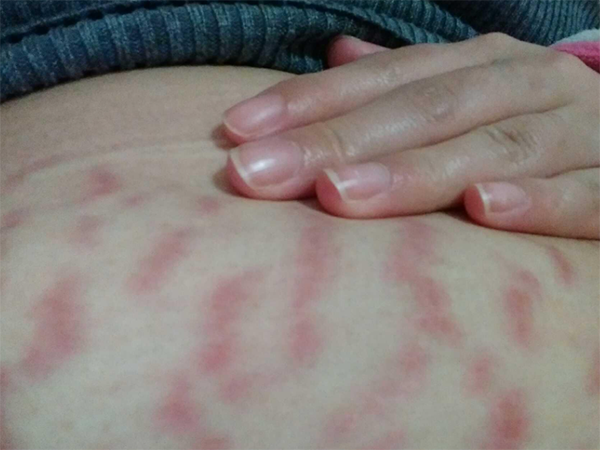 在怀孕期间受雌孕激素影响,再加上胎儿增大,腹部隆起使皮肤弹力纤维、胶原纤维损伤、断裂可形成妊娠纹。刚出现妊娠纹时,皮肤上有粉红色、紫红色不规则纵形条纹,生完孩子后,裂纹颜色逐渐消退,变为银白色条纹。生长纹、肥胖纹刚刚出现时颜色为红色,随着时间推移逐渐褪色。