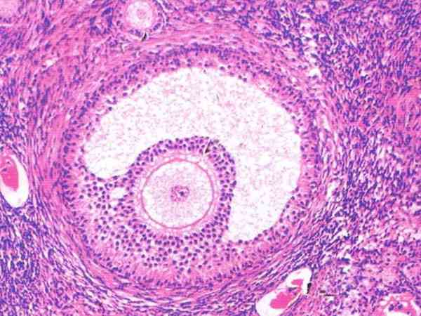 成熟卵泡体积很大,可达到18-20mm,每个月经周期一般只有1个优势卵泡成熟。成熟卵泡卵泡腔很大,卵丘很明显,内膜细胞呈多边形、胞质清亮、胞核圆形,外膜细胞位于最外层,多呈梭形,与周围结缔组织分界不明显。